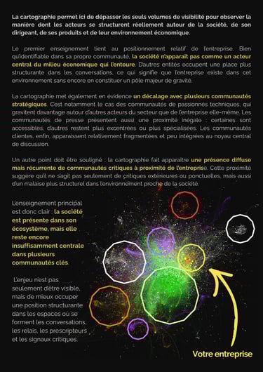 Notre travail articule plusieurs niveaux de lecture : un socle quantitatif, une lecture qualitative des contenus, une analyse des acteurs et des communautés, puis une interprétation stratégique directement utile à la décision. Cette logique permet d’enrichir les reportings existants sans s’y substituer, en produisant des indicateurs plus pertinents et plus situés.
