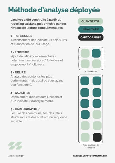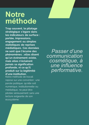 Chez VertNoir nous considérons que l’efficacité d’une communication ne se mesure pas à son volume sonore, mais à sa capacité à structurer durablement le réel. C’est pourquoi notre méthode consiste à dépasser les indicateurs standards pour reconstruire une lecture plus exigeante, plus située et plus utile à la décision.